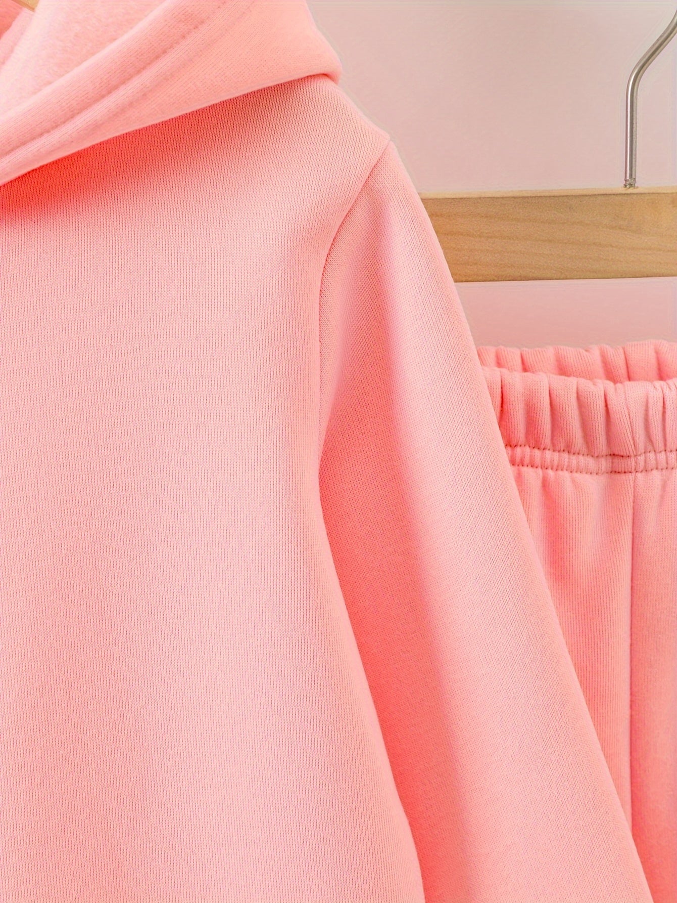 Kapuzensweatshirts für Mädchen für Herbst und Winter mit gemusterten Drucken, gefüttert mit warmem Fleecestoff, kombiniert mit Sporthosen.